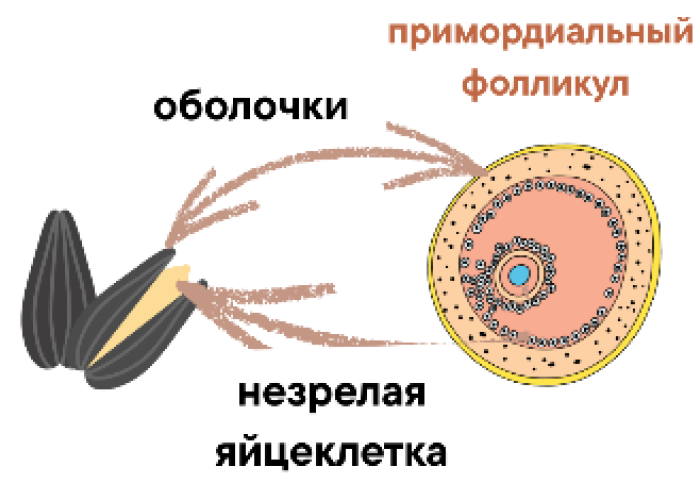 | В яичниках девочки ещё до рождения формируются примордиальные фолликулы – крошечные «зёрнышки», из которых впоследствии развиваются зрелые яйцеклетки. Каждый такой фолликул состоит из незрелой яйцеклетки (ооцита) и оболочки – тонкого слоя клеток, которые её защищают и питают. Фолликул можно сравнить с семечком подсолнуха: само семя похоже на яйцеклетку, кожура семян – на оболочки. И семечко, и фолликул когда-нибудь дадут начало новой жизни. |