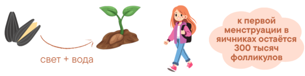 Пока семечко подсолнуха лежит сухим, оно «спит». Но если посадить его в землю и полить, оно прорастёт. Так же и в организме женщины: до определённого момента фолликулы «спят», а активироваться они начинают под действием гормонов, когда наступает подростковый возраст.